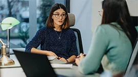 eine Frau, die mit einer anderen Frau an einem Schreibtisch sitzt