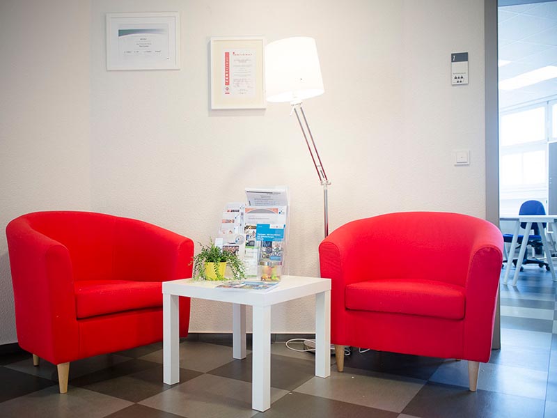 Das aufwändig renovierte hellblaue Haus mit roten Fensterrahmen erinnert an die klassischen Gebäude der Zwanzigerjahre. Ganz modern hingegen ist die Ausstattung der Schulungsräume, die im ersten und vierten Obergeschoss untergebracht und bei Bedarf auch per Fahrstuhl erreichbar sind. Hier findet der Unterricht zwischen 8 und 16:15 Uhr statt. Beim Blick aus den hohen Fenstern genießen Sie – je nach Etage – die Sicht auf die historischen Fassaden oder über die Dächer der Altstadt. In beiden Stockwerken steht Ihnen jeweils ein Pausenraum mit runden Tischen und bequemen Stühlen zum gemütlichen Beisammensein zur Verfügung. In der oberen Etage können Sie sich auch in der Lounge-Ecke mit Couch und Sesseln entspannen.