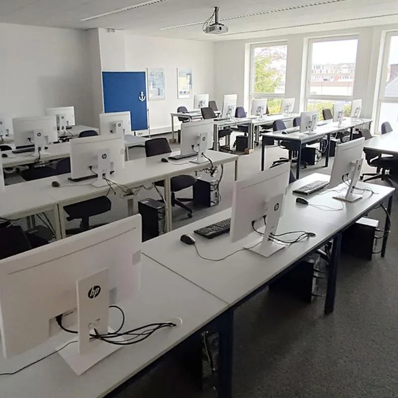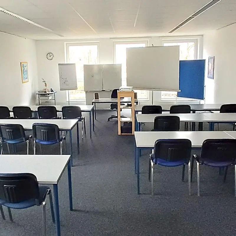 Das Gebäude ist barrierefrei und verfügt über einen Fahrstuhl. Zu den Räumlichkeiten gehört eine gut ausgestattete Küche, damit Sie sich zwischendurch die wohlverdiente Stärkung gönnen können. Die Schulungsräume selbst wirken mit ihren weißen Schreibtischen und Monitoren frisch und modern. Die bodentiefen Fenster lassen angenehm viel Tageslicht herein.