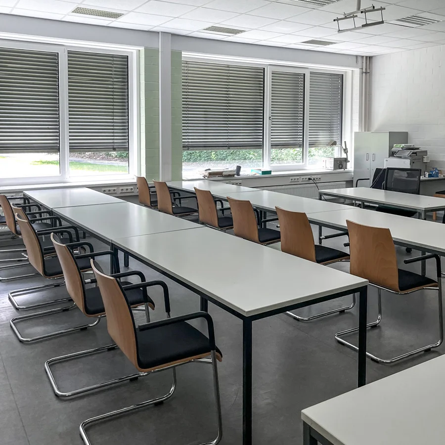 Innerhalb des Gebäudes erwarten Sie helle, freundliche Seminarräume und hochmodern ausgestattete Arbeitsplätze. Hier findet der Unterricht zwischen 8 und 16:15 Uhr statt. Sollte Ihr Blick einmal vom Monitor abschweifen, können Sie die direkte Aussicht in den Wald genießen - bei geöffnetem Fenster sogar inklusive Vogelgezwitscher. Die Lage inmitten eines Waldrandgebietes mit altem Baumbestand lädt in den Pausen zu Spaziergängen ein, und für eine kleine Stärkung zwischendurch sorgt ein Kiosk mit Imbiss, der sich direkt auf dem Gelände befindet. Beliebt sind auch die regelmäßigen Brunchtermine, und im Sommer wird gern auch mal der Grill angefeuert.