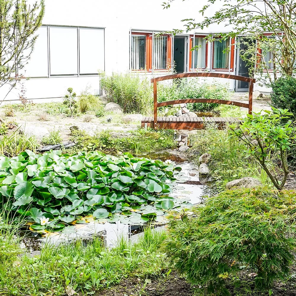Die Schulungsräume befinden sich im Erdgeschoss des Bürokomplexes in der Gebrüder-Boll-Straße 1 A und bieten einen Blick aufs Grüne. Zwischendurch muss natürlich auch mal Zeit zum Entspannen bleiben – zum Beispiel in der Lounge mit Blick auf den japanisch angelegten Innenhof.