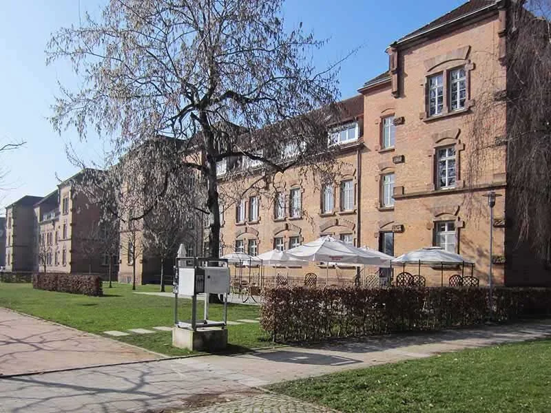 Das historische Kasernengebäude in der Weingartenstraße 34 B wurde 2008 neu saniert. Ihre Schulungsräume im zweiten Obergeschoss sind bei Bedarf mit dem Fahrstuhl erreichbar und vermitteln mit ihren hohen Decken ein angenehmes Raumgefühl. Vormittags schaut die Sonne herein, nachmittags bleibt es im Sommer angenehm kühl. Der Blick nach draußen fällt auf den Platz der Verfassungsfreunde. Ihre Unterrichtszeit liegt zwischen 8 und 16:15 Uhr, in Pausen können Sie sich in der kleinen Teeküche stärken.