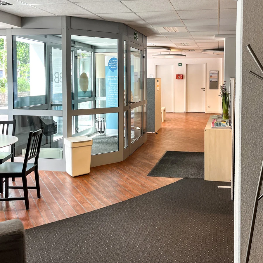 Durch den überdachten Eingangsbereich erreichen Sie die großen, lichtdurchfluteten Schulungsräume im Erdgeschoss. Der Zugang ist barrierefrei. Ihre Unterrichtszeit liegt zwischen 8 und 16:15 Uhr, aber auch Pausen sind natürlich wichtig. Wer eine Stärkung braucht, findet Kaffeemaschinen, Mikrowellen und Wasserkocher in der Küche.