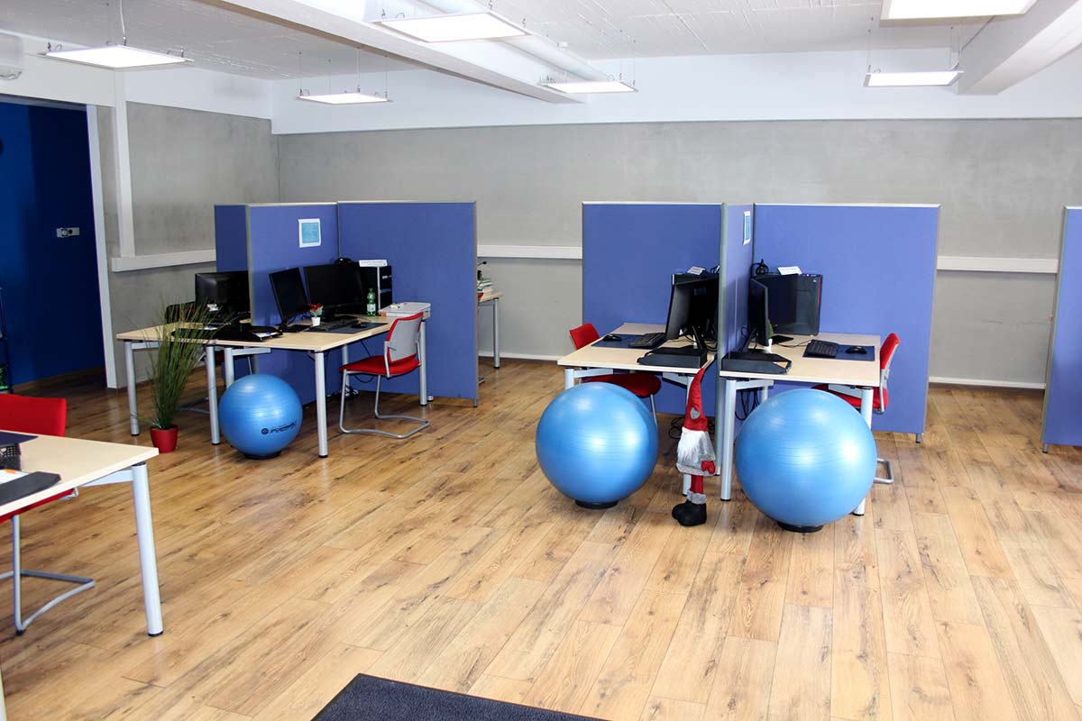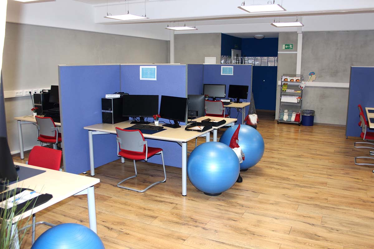 Der Standort in Weinheim ist mit öffentlichen Verkehrsmitteln oder auch mit dem PKW gut erreichbar; Autofahrer finden ausreichend Parkmöglichkeiten. Hereinkommen und wohlfühlen: Starten Sie den Tag mit einer Tasse Kaffee und nehmen Sie an Ihrem höhenverstellbaren Schreibtisch Platz. Oder fahren Sie ihn als Steharbeitsplatz ganz nach oben. Wer möchte, kann den Stuhl zwischendurch auch gegen Sitzbälle tauschen. Stärken Sie sich während des Lerntags mit freien Getränken und „Nervennahrung“ – es steht alles für Sie bereit. Lesebrille vergessen? Sogar Ersatzbrillen liegen hier parat. Auch sonst haben die Mitarbeitenden vor Ort immer ein offenes Ohr für alles, was Ihnen auf dem Herzen liegt. Und Menschen mit Handicap sind selbstverständlich „mittendrin“.